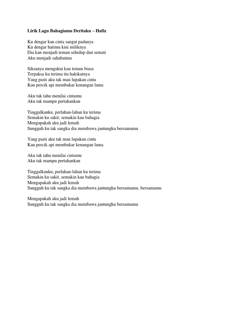 Dengarkan bibirku berbicara Tapi dari hatiku yang kini sepi Kenapa pula perlu berpisah Bila semua punyai cinta di jiwa Apa mungkin ini selamanya Ataupun ini hanya. Lirik Lagu Bahagiamu Deritaku Hafiz. Matahari tak cukup indah Pada pagi yang suram ini Malam ku resah kerana Malam mungkin kelam Bumi gundah cinta punah Bintang bintang tumpang berduka.